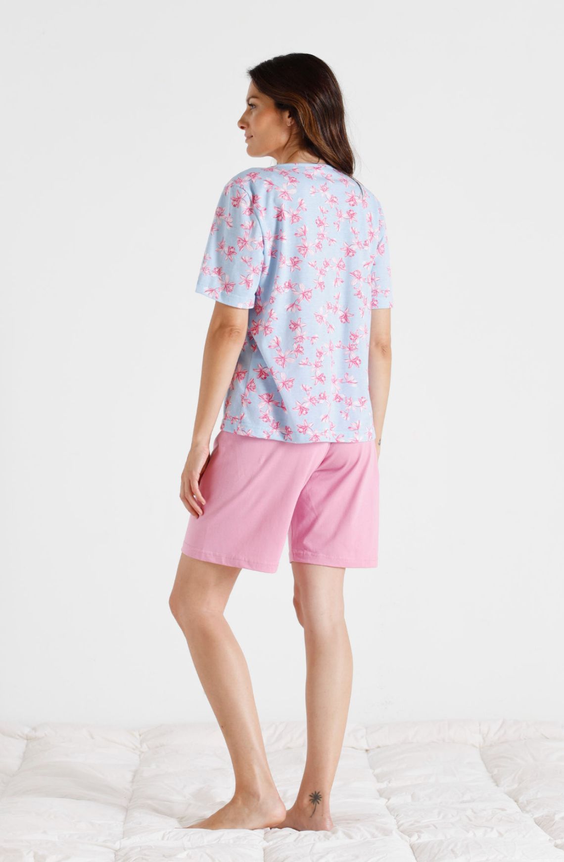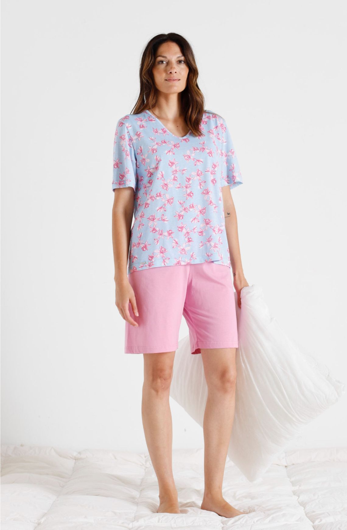 La camiseta estampada es tanto moderna como clásica, lo que te permite lucir siempre a la moda mientras disfrutas del descanso en casa. Cada detalle ha sido cuidadosamente pensado para asegurar un ajuste perfecto, permitiendo que te sientas libre y sin restricciones. El Pijama Mujer Corto Pico Algodón BELTY no solo es un atuendo para dormir, sino que también es un reflejo de tu estilo personal.
