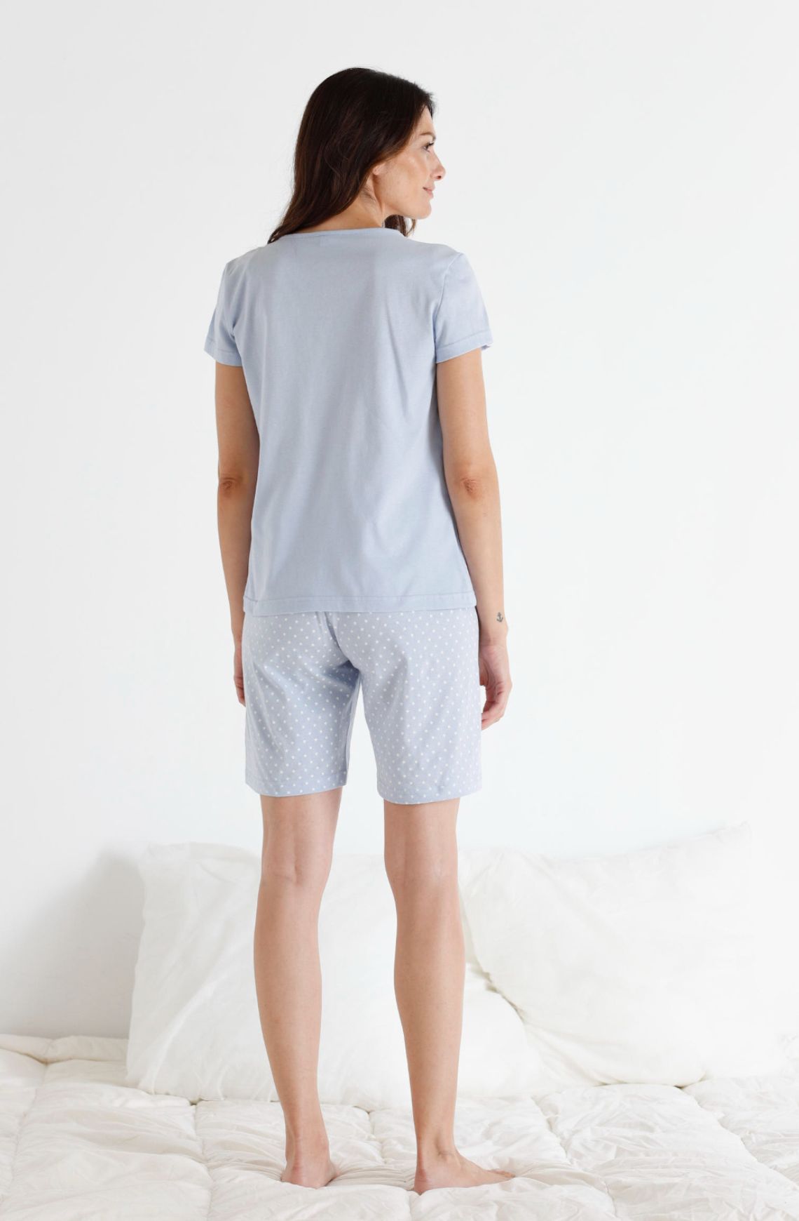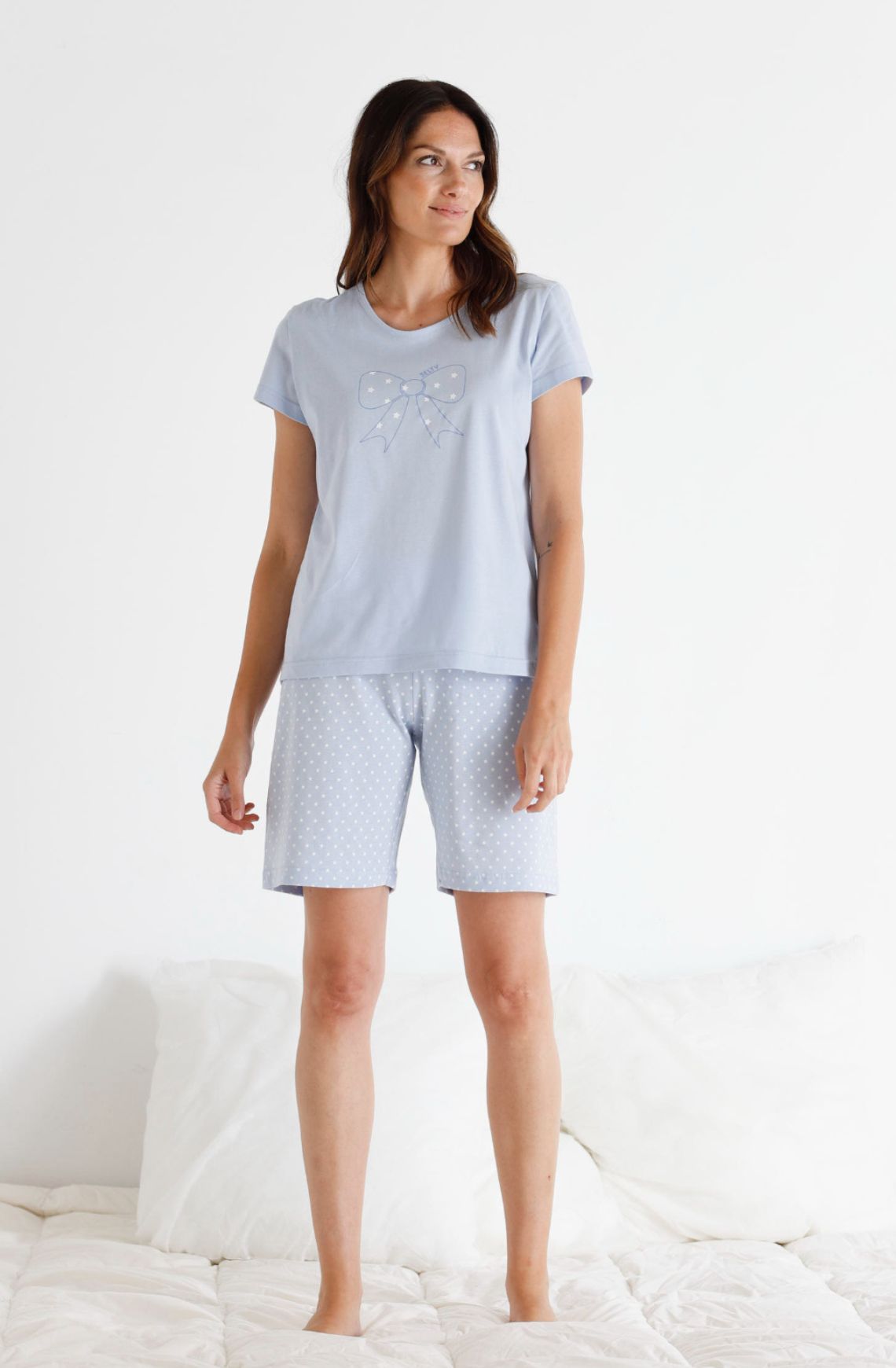 Este pijama incluye una camiseta lisa con un lazo grande estampado, que le añade un toque femenino y delicado. El pantalón corto de lunares complementa perfectamente, ofreciendo un atractivo visual que no pasa desapercibido.