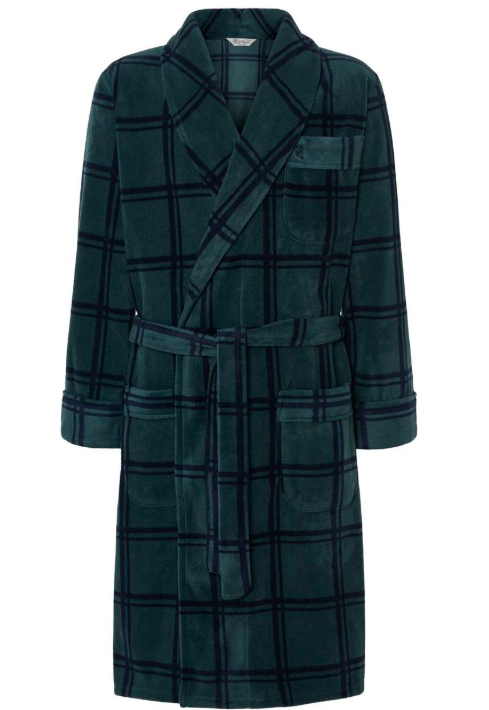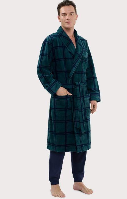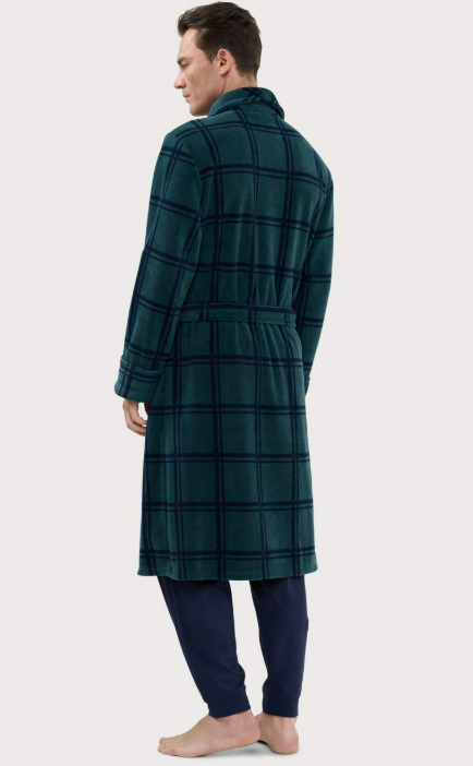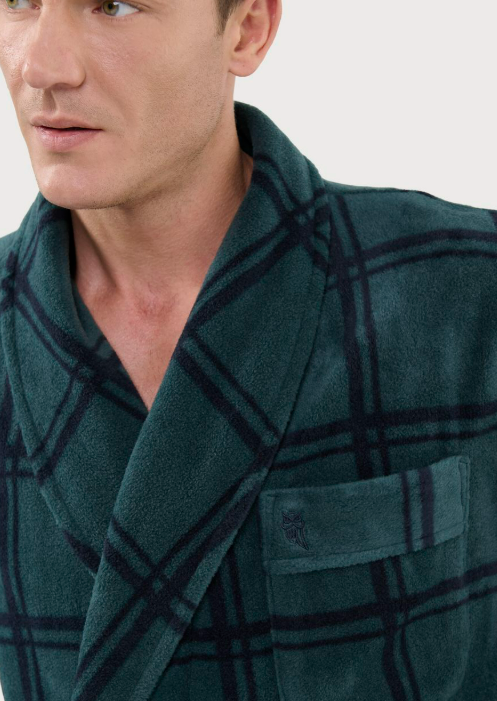 La bata presenta un elegante color verde oscuro con un clásico estampado de cuadros azul marino. El diseño incluye un logo bordado en el pecho, añadiendo un toque sutil de distinción. Es una prenda cómoda y suave que aporta confort total, envolviéndote en calidez y suavidad.