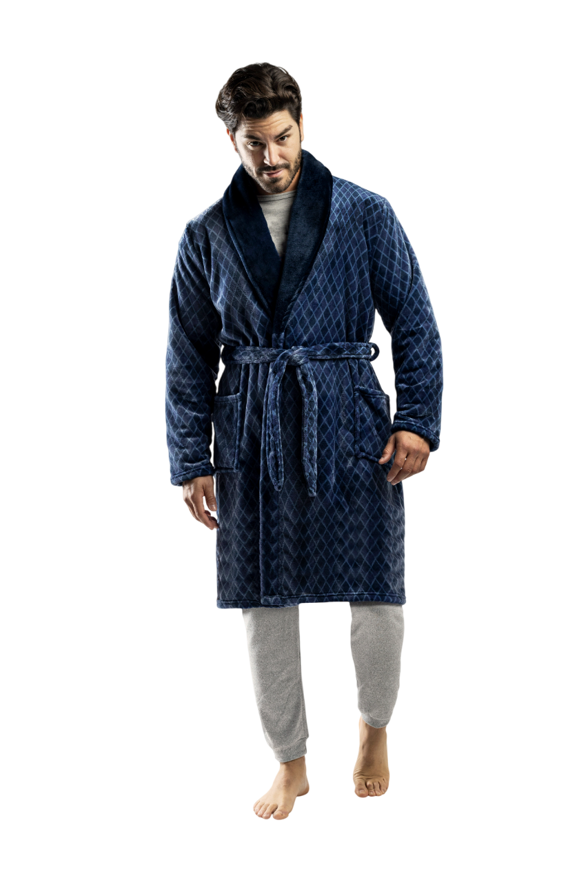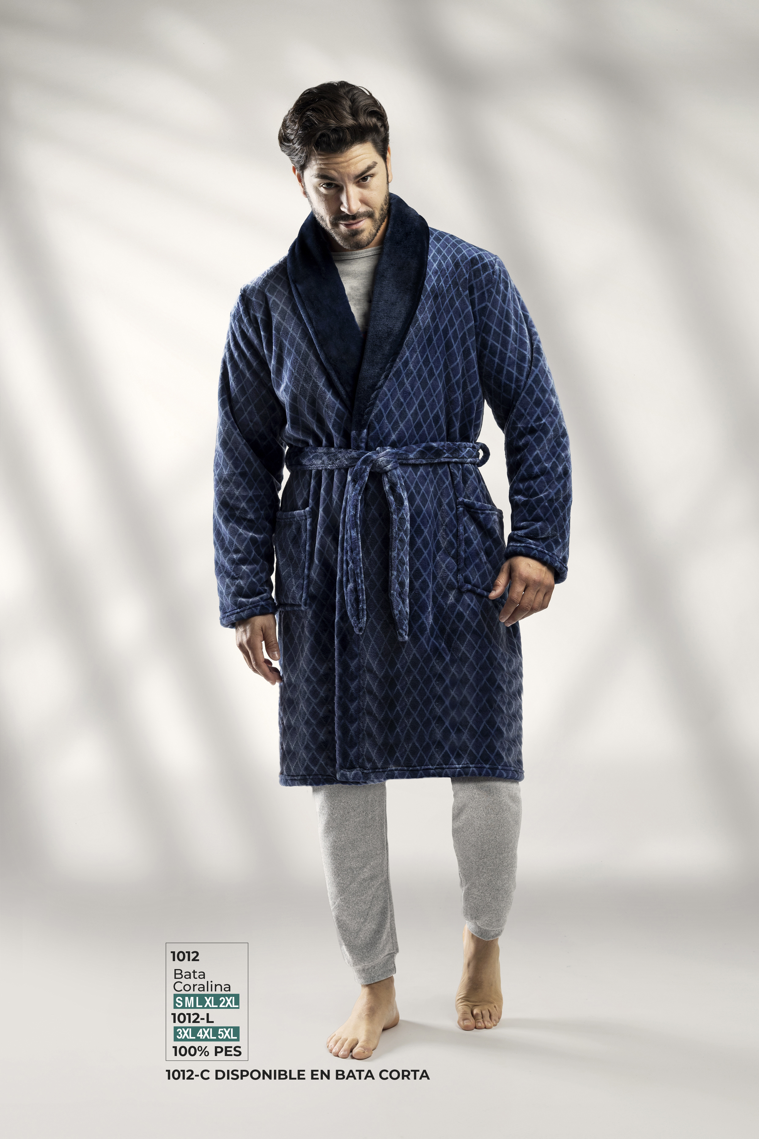 1012cc_ M_MarinoLa bata para hombre cruzar en coralina con estampado en rombos es ideal para el invierno 2025-2026. Diseñada para ofrecer estilo y confort, cuenta con dos bolsillos prácticos y un cinturón que permite ajustar el talle. La coralina proporciona una textura suave y mantiene el calor, ideal para las noches frías.