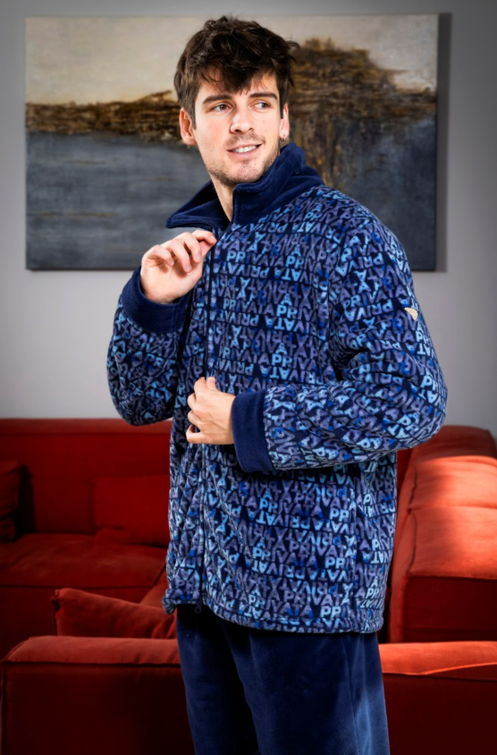 Sumérgete en el confort con nuestra Bata de hombre con cremallera corta, una prenda esencial para las frescas noches de invierno. Esta bata, cuidadosamente diseñada, presenta un marcado estilo moderno gracias a su estampado exclusivo de letras "PRIVATA" que le otorga un aire único y sofisticado.
