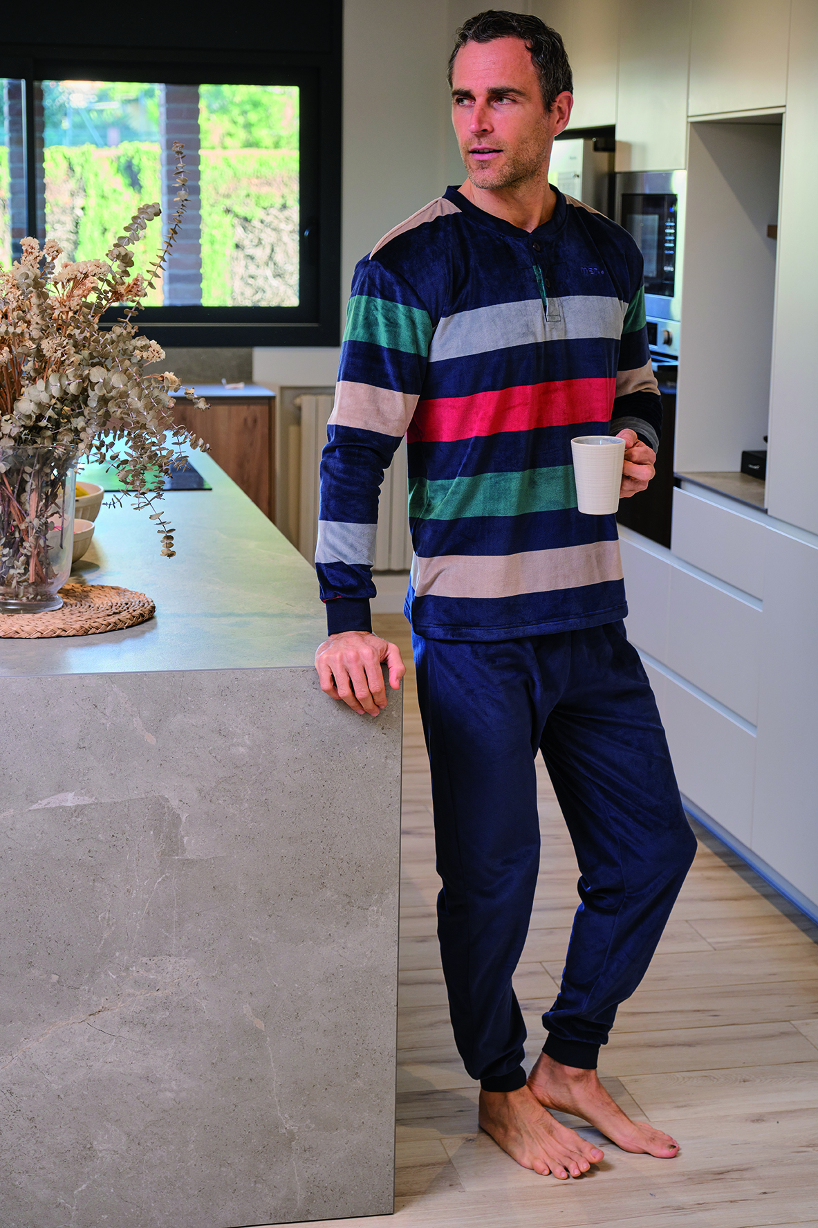 El Pijama Hombre Terciopelo Puño Mushler ofrece comodidad excepcional gracias a su terciopelo de alta calidad. La camiseta presenta un diseño de listas horizontales con una tapeta de 2 botones. Los puños en las mangas y pantalón aseguran ajuste y calidez, ideal para el invierno. El pantalón liso complementa el conjunto, manteniendo un estilo elegante.