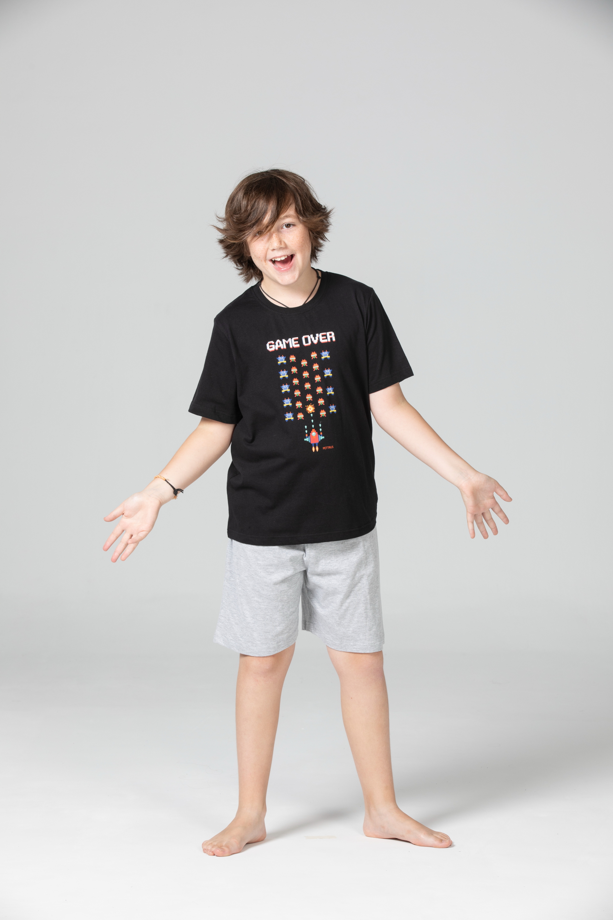- Camiseta negra de cuello redondo con un divertido estampado de un juego de marcianitos que seguro encantará a tu pequeño.