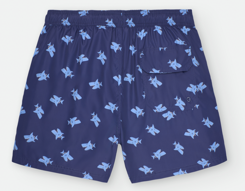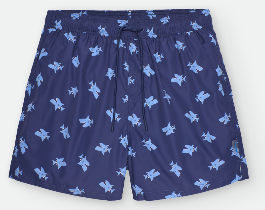 - Estampado Atrevido: Presenta un estampado de tiburones que nadan sobre un fondo de color azul oscuro, capturando la esencia del océano.