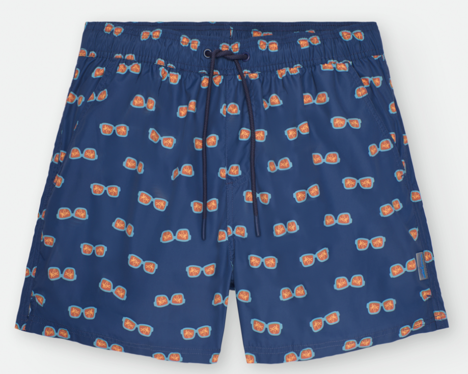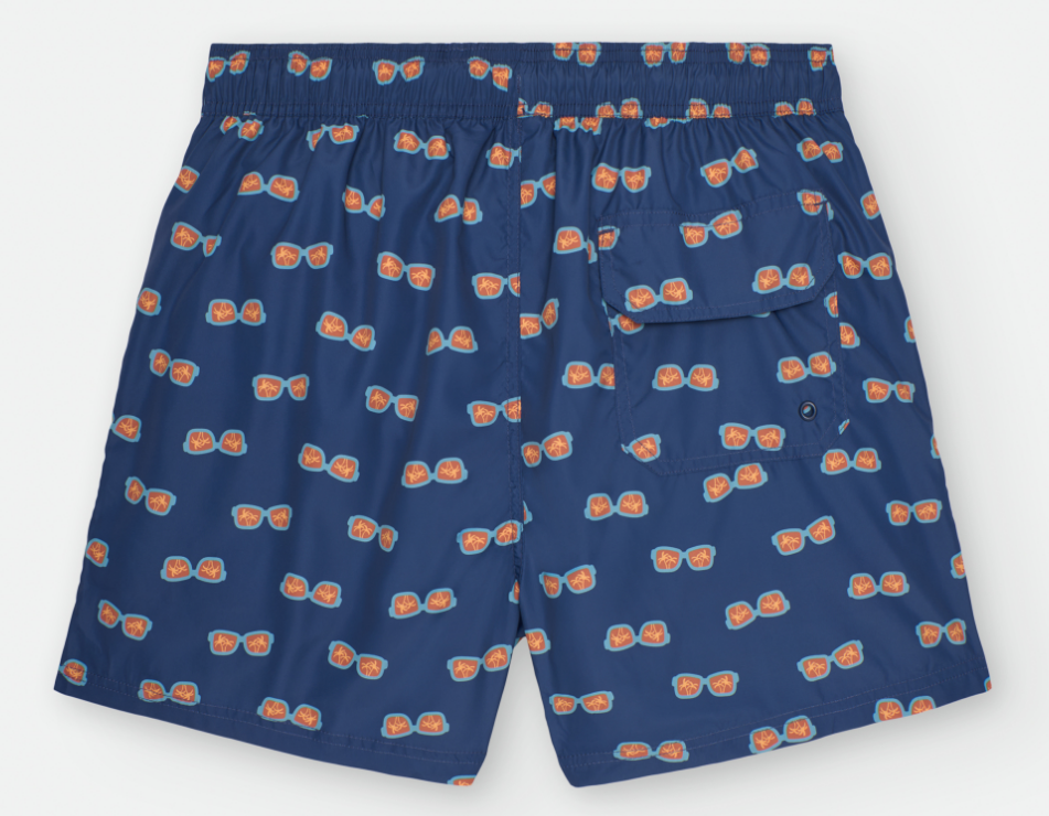 - Estampado único: Impresionante diseño de gafas sobre un fondo color azul oscuro que añade un toque distintivo y moderno al bañador, perfecto para destacar en la playa o la piscina.