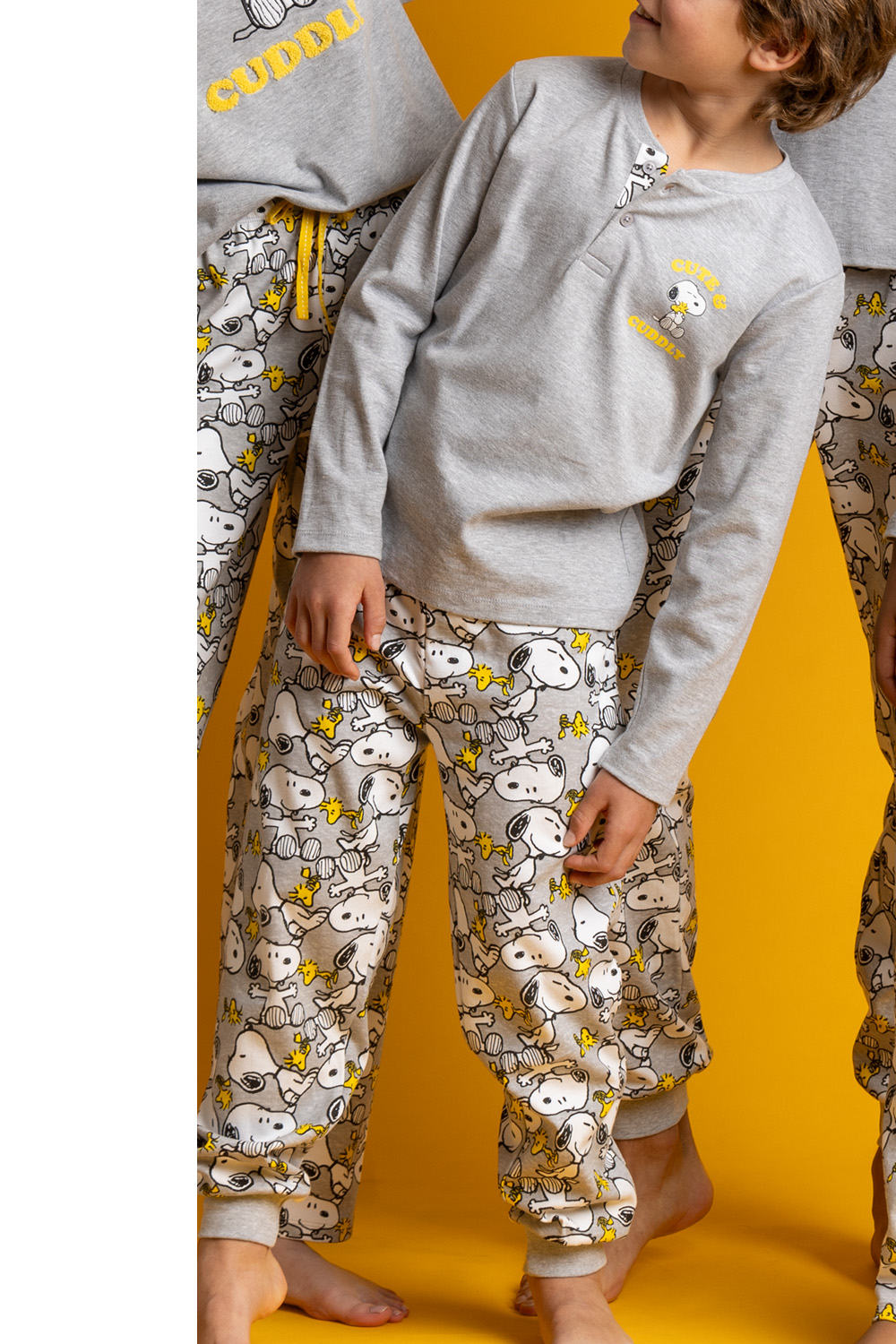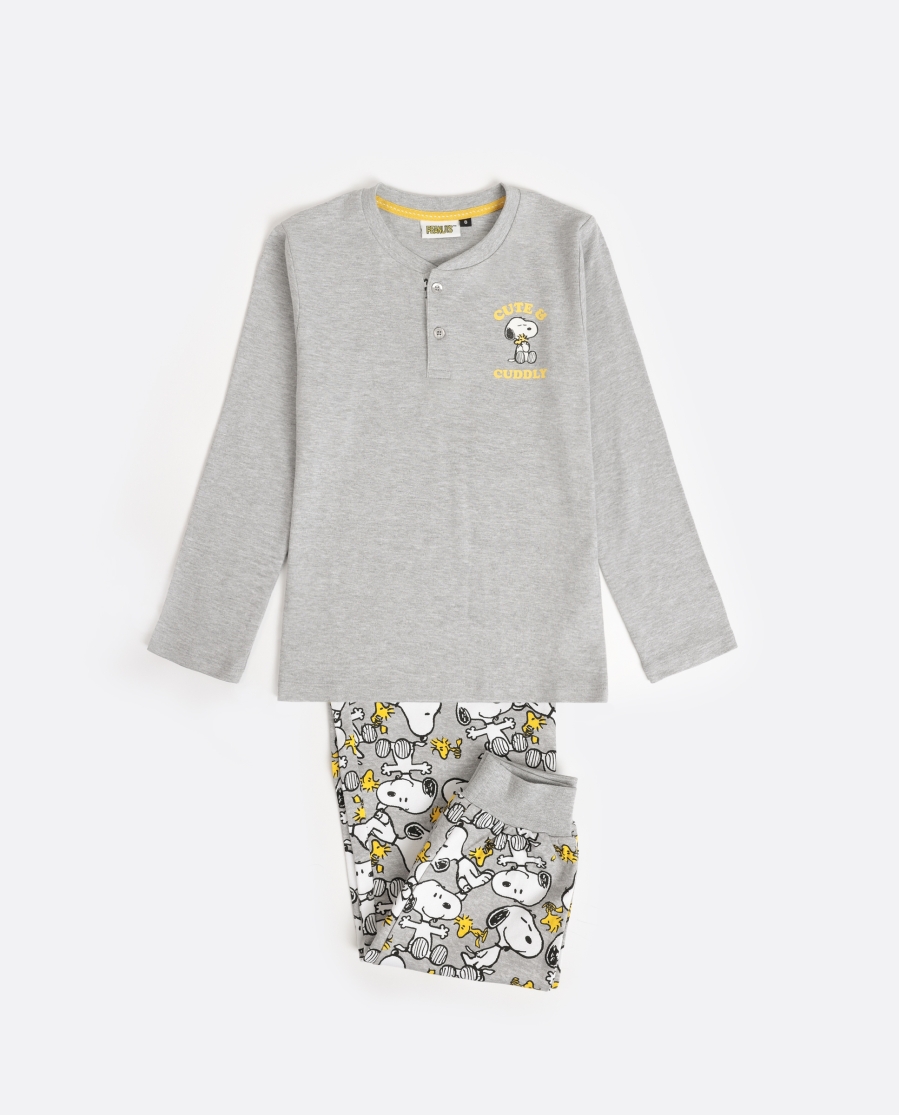 62458ps_4_GrisEl Pijama Niño Algodón Tapeta Puño Aznar Innova ofrece comodidad y estilo con su material de punto de algodón. Incluye una camiseta de manga larga con cuello de tapeta de botones y un pantalón de punto estampado con ajuste seguro. Su suavidad lo hace ideal para pieles sensibles. Lavar a máquina a 30 grados y evitar la lejía. Compuesto principalmente de algodón, es perfecto para el invierno, con diseño exclusivo de Peanuts y Aznar Innova.