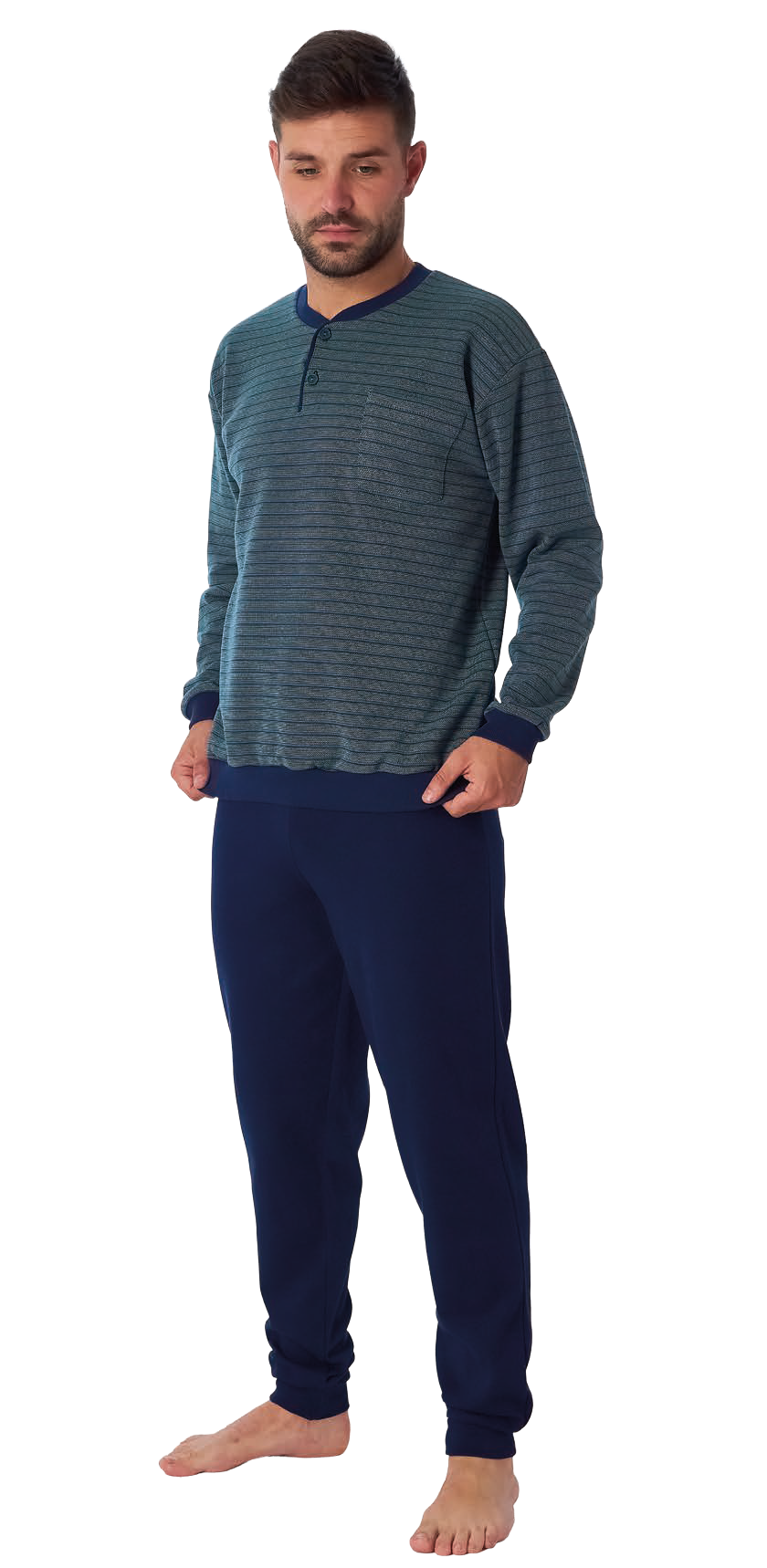 El pijama para hombre DORMEN es perfecto para el invierno, confeccionado en 60% algodón y diseñado con cómodos puños, un práctico bolsillo en el pecho izquierdo y un elegante diseño de franjas. Su tejido interlock perchado garantiza suavidad y confort, proporcionando calidez para las noches frías. Ideal para quienes buscan un descanso acogedor y un aspecto moderno en casa durante la temporada invernal.