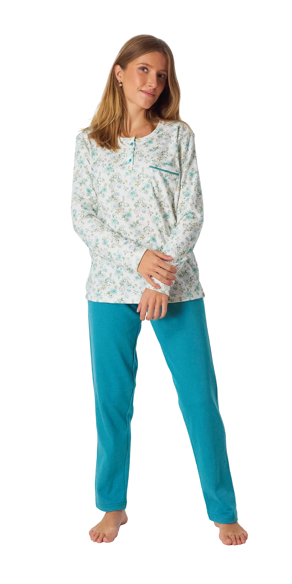 La comodidad y el estilo se entrelazan perfectamente con el Pijama Mujer Algodón Flores LENISS. Diseñado pensando en ofrecer calidez y suavidad, este pijama es ideal para acompañarte en las noches más frías del invierno. Confeccionado con un 100% de algodón interlock perchado, su textura proporcionada por el tejido de alta calidad asegura una sensación de confort absoluto.