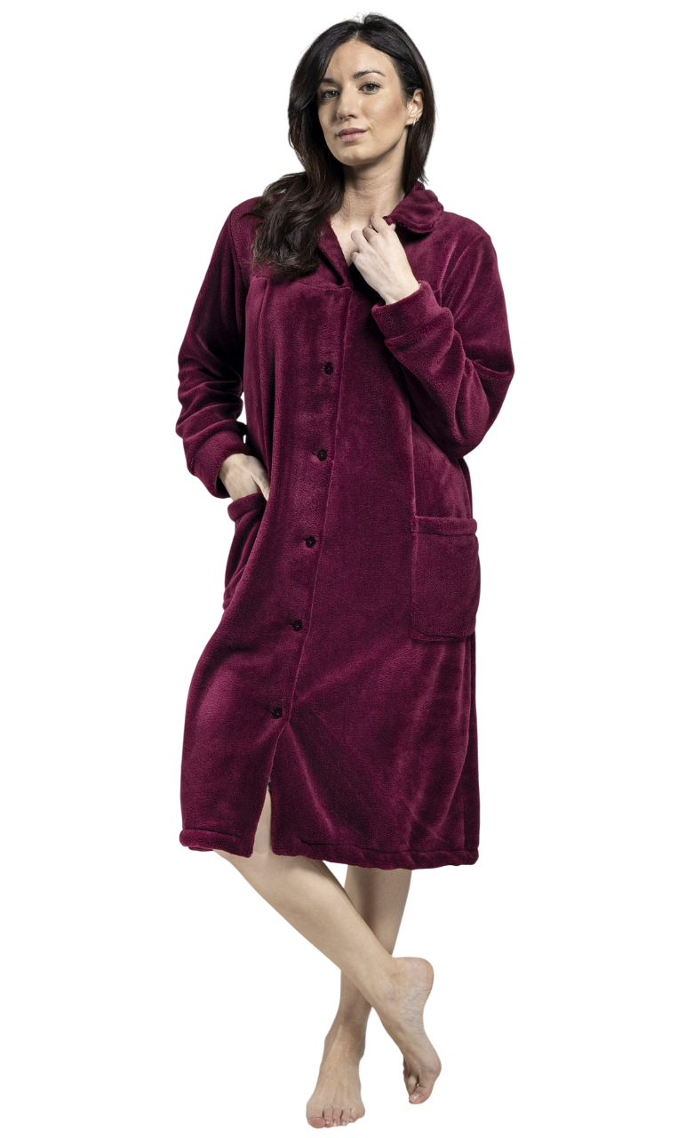 8602bb_ M_BurdeosLa Bata Mujer Botones Lisa Coralina LIN es una prenda perfecta para el invierno 2025-2026, combinando estilo y confort. Fabricada en tejido de coralina, ofrece suavidad y retención de calor. Con un diseño elegante de botones al frente, incluye dos bolsillos prácticos. Ideal para el hogar, se ajusta a las tendencias de invierno y es perfecta para aquellas que buscan moda y funcionalidad en el descanso. Es un complemento ideal y un regalo excelente para disfrutar del frío con calidez y comodidad.